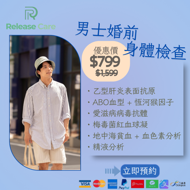 包括: 乙型肝炎表面抗原、愛滋病病毒抗體、血色素分析、梅毒血清試驗、類猴因子、德國痲疹抗體G、ABO血型 、精液分析、常規檢查, 如: 膽固醇、小便狀況、中英文報告及專人解說報告 等等